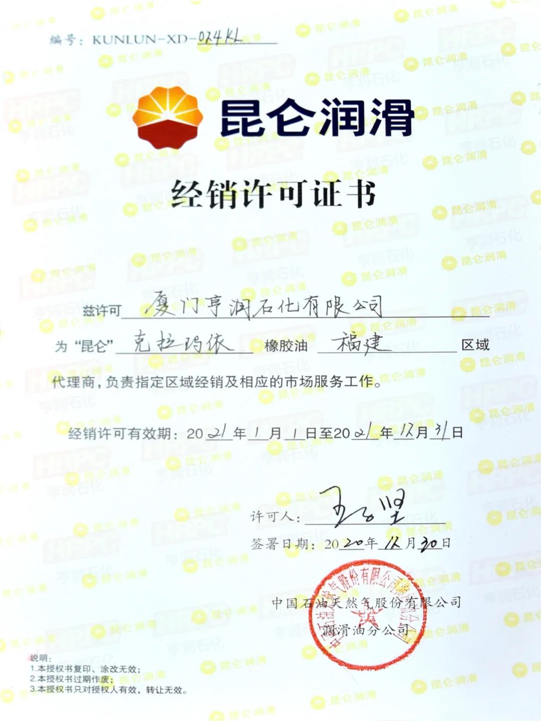 近日,在刚刚落幕的2021年度中国石油特种油经销商大会(无锡)上,厦门亨润石化有限公司被授予“昆仑”克拉玛依橡胶油福建区域指定经销商,负责在福建区域内的销售及市场维护工作!