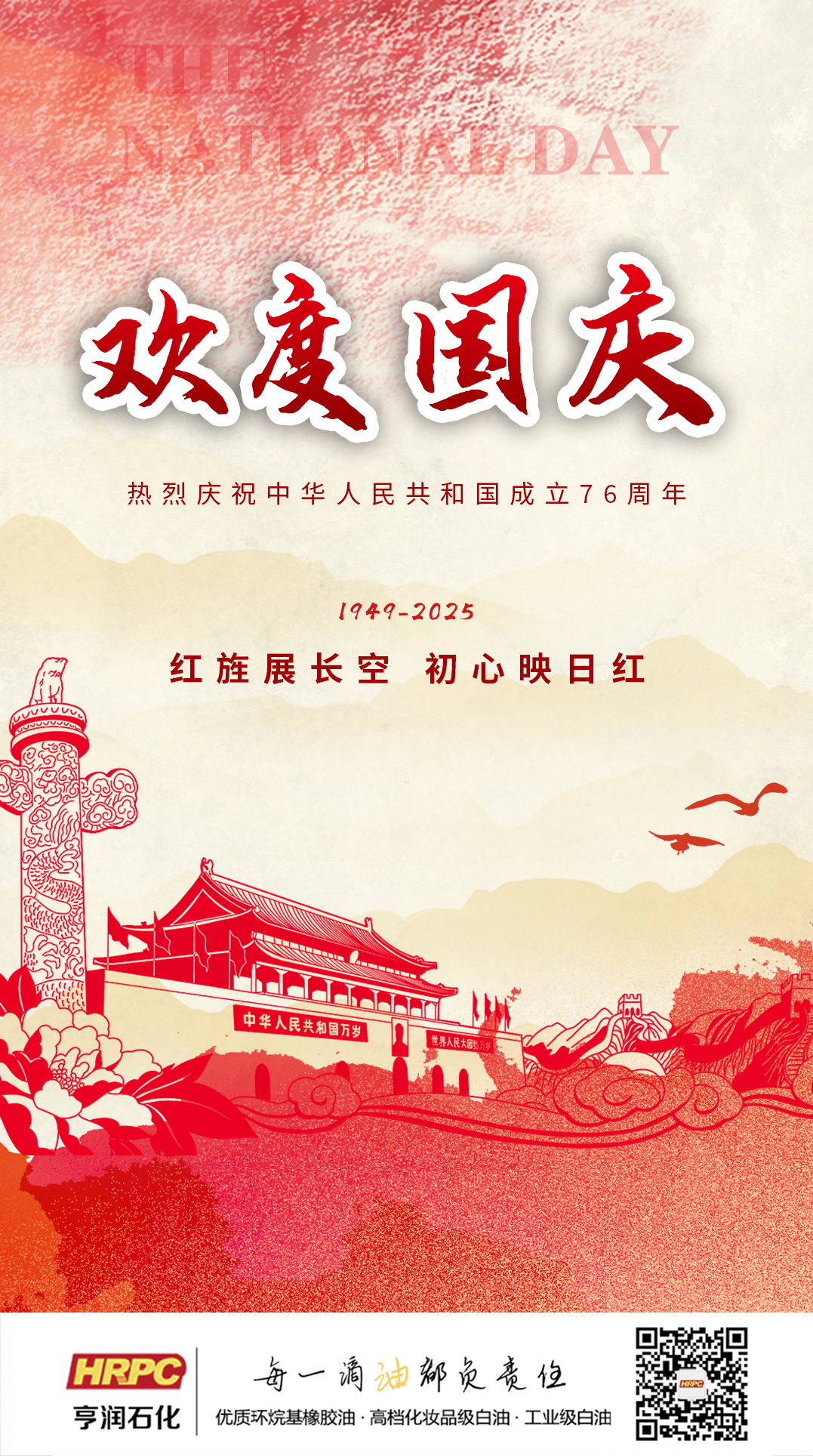 值此“十一·国庆节”盛典 亨润石化公司 礼赞祖国华诞,共赴时代华章! 祝福伟大的祖国 盛世永驻,宏图大展,生日快乐! 惟愿莘莘吾辈 豪承壮志,阔步新程,续写华章!