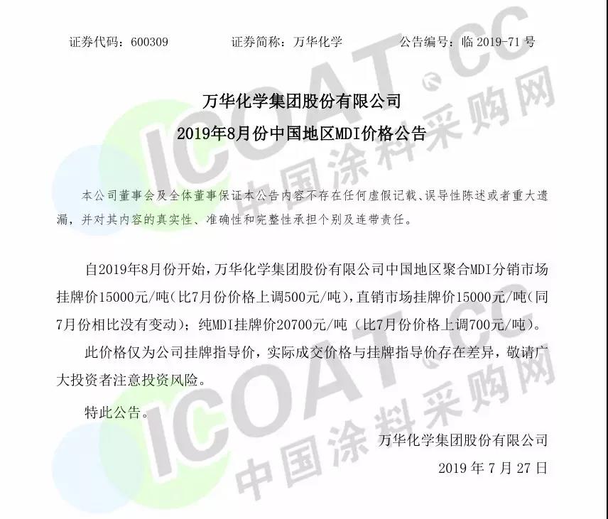 近日,万华化学集团股份有限公司发布公告,称自2019年8月份开始,万华化学中国地区聚合MDI分销市场挂牌价15000元/吨(比7月份价格上调500元/吨),直销市场挂牌价15000元/吨(同7月份相比没有变动);纯MDI挂牌价20700元/吨(比7月份价格上调700元/吨)。