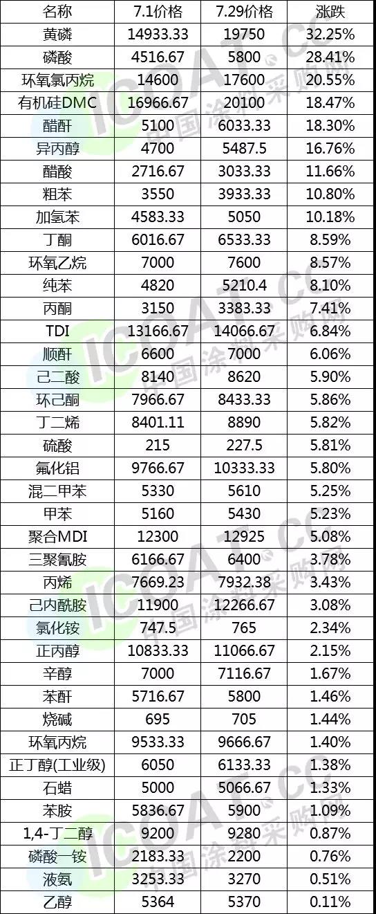 据涂料采购网了解,近期受到一些事故等影响,化工原材料价格波动较大。以下为涂料采购网整理的7月以来部分化工原材料的价格涨跌榜。