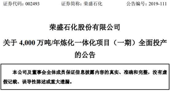 公告称,浙石化在舟山绿色石化基地投资建设的“4,000 万吨/年炼化一体化项目(一期)”已在2019年5月将第一批装置(常减压及相关公用工程装置等)投入运行。