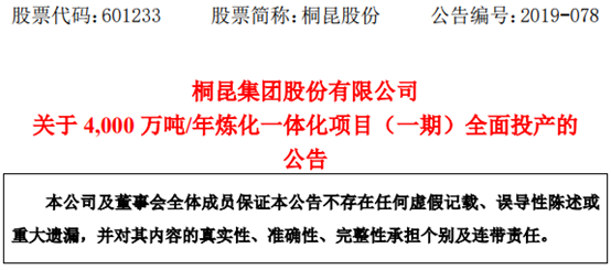 2019年12月30日,荣盛石化和桐昆股份发布公告,宣布其参股的浙石化4000万吨/年炼化一体化项目(一期)全面投产。