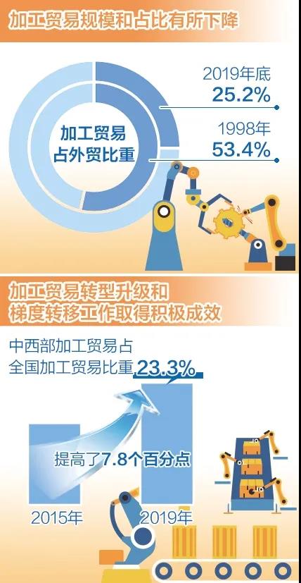 近年来,国内外环境发生了深刻的变化,加工贸易规模和占比也有所下降,占外贸比重由1998年最高时的53.4%降至去年底的25.2%。同时,加工贸易转型升级和梯度转移工作也取得了积极成效,2019年中西部加工贸易占全国加工贸易比重,比2015年提高了7.8个百分点,达到了23.3%。
