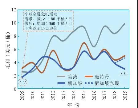 全球经济低迷导致油品需求增速达近五年最低,同时亚太和中东引领炼油产能快速增长,供需过剩导致2019年炼油毛利弱于预期,其中新加坡炼油中心毛利同比降低23%。