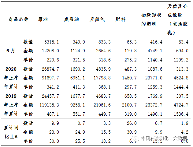 2020年上半年,原油累计进口2.69亿吨,同比增长9.9%;成品油进口1690.2万吨,同比微增0.7%;天然气进口4835.9万吨,同比增长3.3%;肥料进口487.3万吨,同比下降26.0%;初级形态塑料1887.6万吨,同比增长6.7%;天然及合成橡胶(含胶乳)进口313.3万吨,同比增加1.9%。