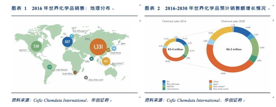 据Cefic Chemdata 的统计,2016年全球化学品的销售额为3360亿欧元,其中亚洲化学品销售额达到2068亿欧元。中国化学品销售额为1331亿欧元,占亚洲化学品销售额的64.37%,占世界化学品销售额的39.6%,是世界上最大的化学品销售国家。