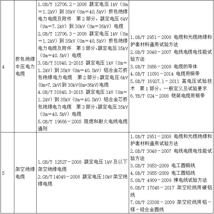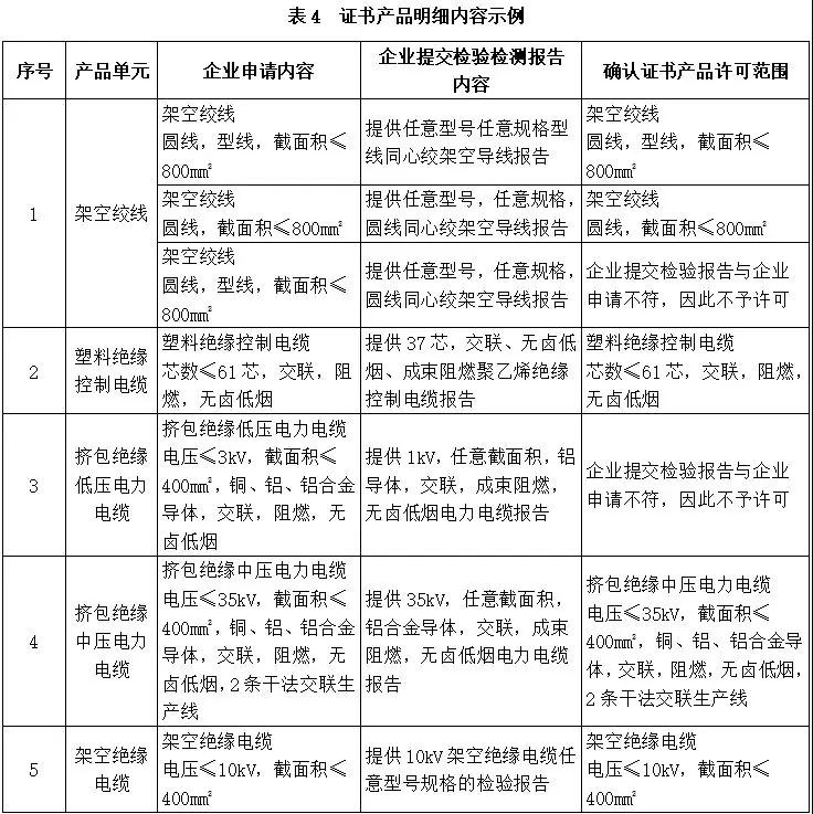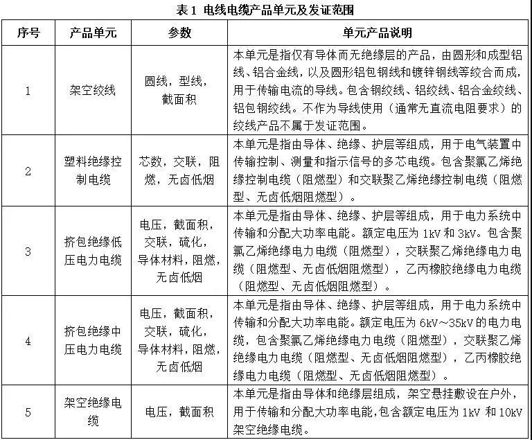 实施工业产品生产许可证制度管理的电线电缆产品包括架空绞线、塑料绝缘控制电缆、挤包绝缘低压电力电缆、挤包绝缘中压电力电缆、架空绝缘电缆5个产品单元,具体见表1。