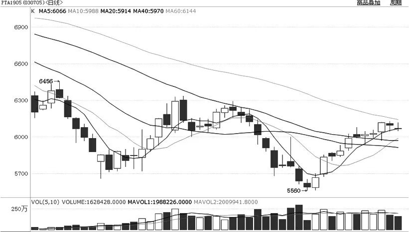 新年以来,PTA期货1905合约在5560元/吨一线触底反弹,期价结束连续收阴下跌的模式,转为连续收阳上涨局势。本周以来,PTA价格已然攀升至6110元/吨一线附近,由于受上方60日均线下移压制,短线调整行情持续。