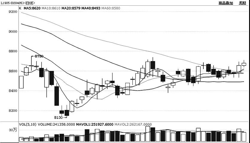 去年11月底以来,塑料期货1905合约完成V形反转走势,期价自低点8130元/吨一线快速反弹。随着价格不断走强,空头压力逐渐体现,在上行至8700元/吨一线后,上涨有所趋缓。本周以来,1905合约维持在8600—8700元/吨区间振荡整理,期价重心较前一周缓慢抬升。