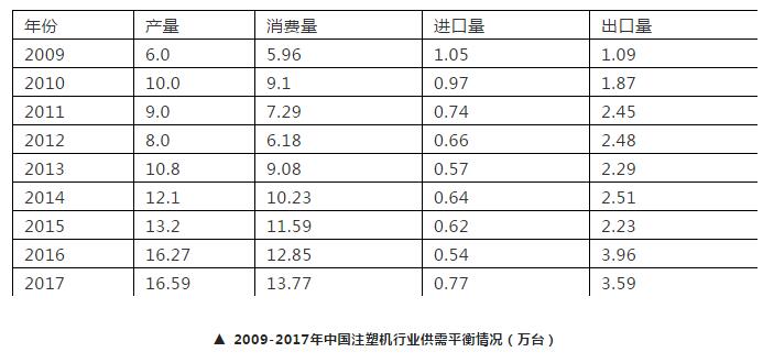 智研咨询发布的《中国注塑行业市场分析及“十三五”发展前景预测报告》数据显示: 2017年我国注塑机行业产量约16.59万台。我国注塑机行业进口约0.77万台,出口3.59万台,行业表观消费量约13.77万台。