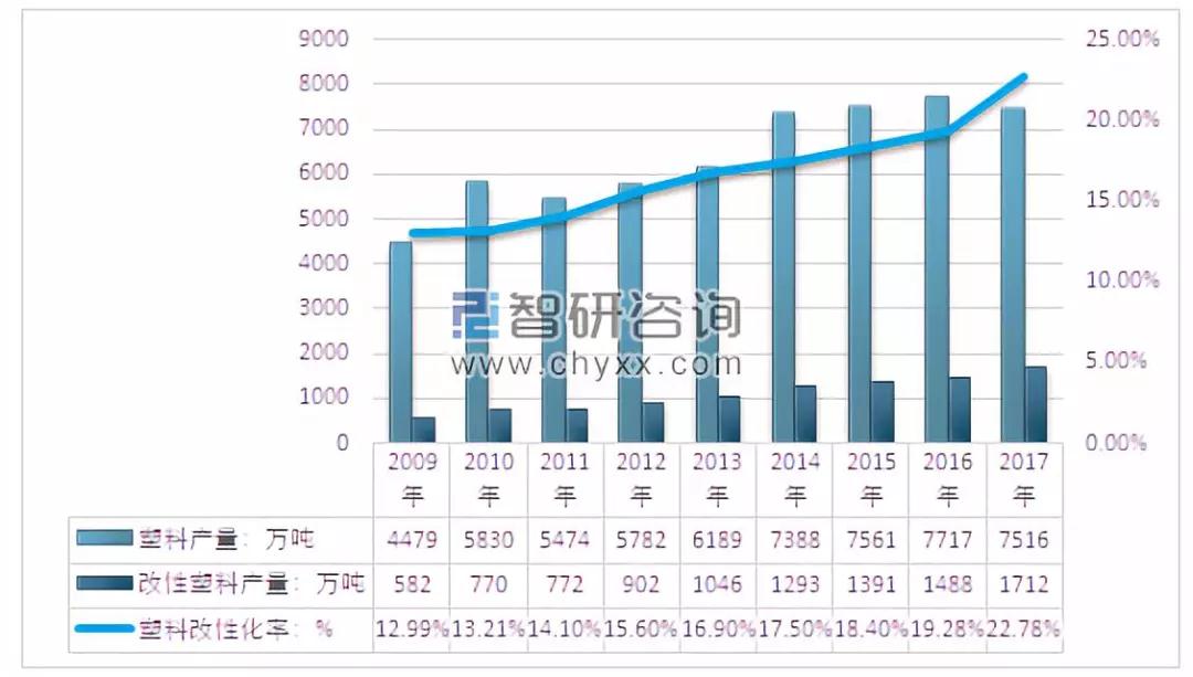 2017年我国塑料制品产量约7515.5万吨,其中改性塑料产量约1712万吨,改性塑料占比塑料产量比重达到了22.78%。近几年我国塑料产量及改性塑料占比情况如下图所示: