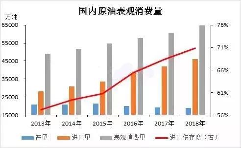 即使中国原油产量在全球范围内高居前列,但受困于国内油田的老化问题,加之近年油价水平偏低,自采原油性价比明显低于进口原油。高昂的开采成本加之国内旺盛的需求,导致不得不增加对进口原油的依赖。近五年来,国内原油产量徘徊在2亿吨左右,但国内需求却稳步提升,进口原油量逐年攀升,至2018年,进口依存度高居70.8%,原油安全迫在眉睫。