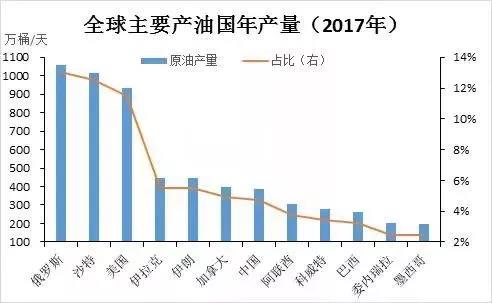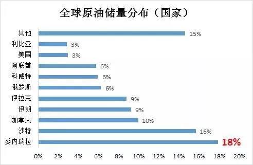 2017年,全球原油的储量共计16966亿桶,从各个国家的原油储量占比来看,第一大原油储量国是委内瑞拉,其他的原油储量主要分布于中东国家,比如沙特、伊朗、伊拉克和科威特等国。此外,对于北美的加拿大和美国来讲,原油储量同样较多。前十大原油储量国并没有中国的身影,中国原油储量仅有257亿桶,占比在1.5%左右,相对国土面积和人数来讲是非常少的。虽然储量较低,但中国原油产量却非常大,如果算上当前开采的速度,也就是用总储量除以每天开采的量,中国原油在不增加储量的前提下,仅能够开采18.3年。对比委内瑞拉,开采期限却是393.6年。