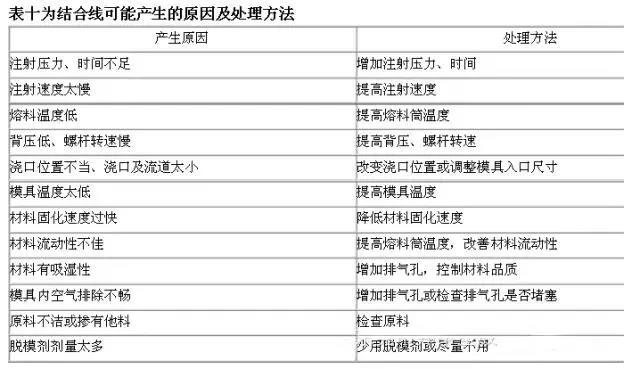 升高材料和模具温度,可使结合线的程度减至最小。同时,改变浇口的位置、数量,使结合线的位置移往他处;或在熔合部设置排气孔,迅速疏散此部位的空气及挥发物;或在熔合部附近设材料溢流池,将结合线移至溢流池,再将其切除等都是有效地消除结合线的对策。