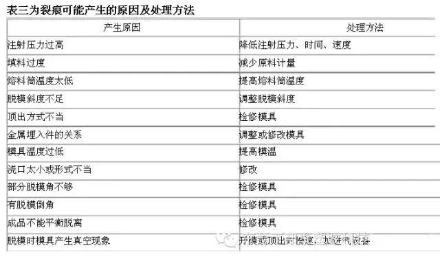 要避免脱模不良所致的裂痕,模具成型空间须设有充分的脱模斜度,顶针的大小、位置、形式等要适当。顶出时,成品各部分的脱模阻力要均匀。 过度充填,是因施加过大的注射压力或材料计量过多,使制品内部应力过大,脱模时造成裂痕,在此状态下,模具配件的变型量也增大,致使更难脱模,助长裂痕(甚至破裂)的发生,此时应降低注射压力,防止过度充填。