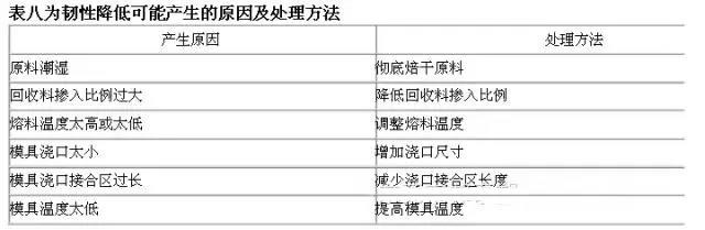 韧性是使材料断裂所需要的能量。引起韧性降低的主要因素有:原料、回收料、温度及模具等。而制品的韧性降低,将直接影响制品强度和机械性能。