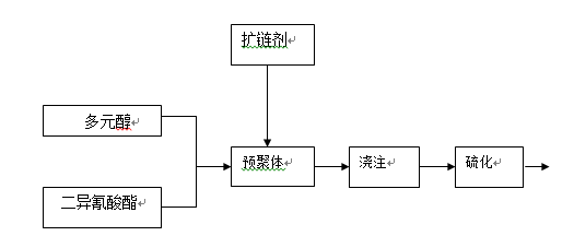 反应过程:多元醇与二异氰酸酯反应,制成低分子量的预聚体;经扩链反应,生成高分子量聚合物;然后添加适当的交联剂,生成聚氨酯弹性体。其工艺流程如下: