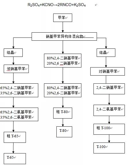 甲苯硝化的第一阶段生成邻位、对位、间位三种硝基甲苯异构体混合物,且其含量分别为55%~60%、35%~40%和2%~5%。异构体的含量几乎不受反应条件的影响。将上述单硝基甲苯混合物进行不硝化生成2,4-二硝基甲苯和2,6二硝基甲苯,其比例为80/20,再经还原和光化制得80/20TDI(T-80)。如单硝基甲苯混合物现经结晶分离出纯的邻位和对位单硝基苯,再分别进行第二次硝化和还原,光化,可制得65/35TDI(T-65)和纯2,4-TDI(T-100)。生产过程见下图: