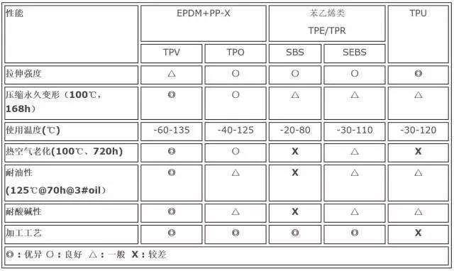 TPV:耐酸碱、油、耐气候、耐高温,抗紫外、弹性最好;拉伸差。