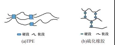 从上图可知,物理交联区的大小和形状随橡胶软链段和树脂硬链段的结构和数量比而变化。虽然橡胶/树脂会形成不同的微相分离结构,但在适当亲合性的组合情况下,树脂部分作为固定橡胶段的物理“交联”,类似于硫化橡胶中的交联网络结构。同时,物理交联随温度的变化可逆,当硬相受热熔融后,TPE发生自由流动,此时可以进行加工;当降为常温后,硬相固化使得TPE的强度恢复。