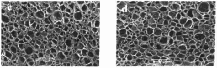 在没有加入SEBS的发泡体系中,泡孔小,泡孔密度也小,而且分布也不均匀,泡孔生长也不充分。而随着SEBS加入量的增加,泡孔变大,生长更充分,分布也更为均匀,相邻泡孔间挤压为不规则形状。