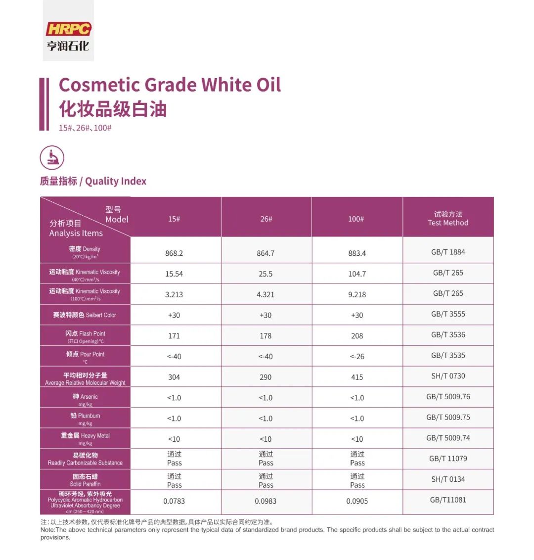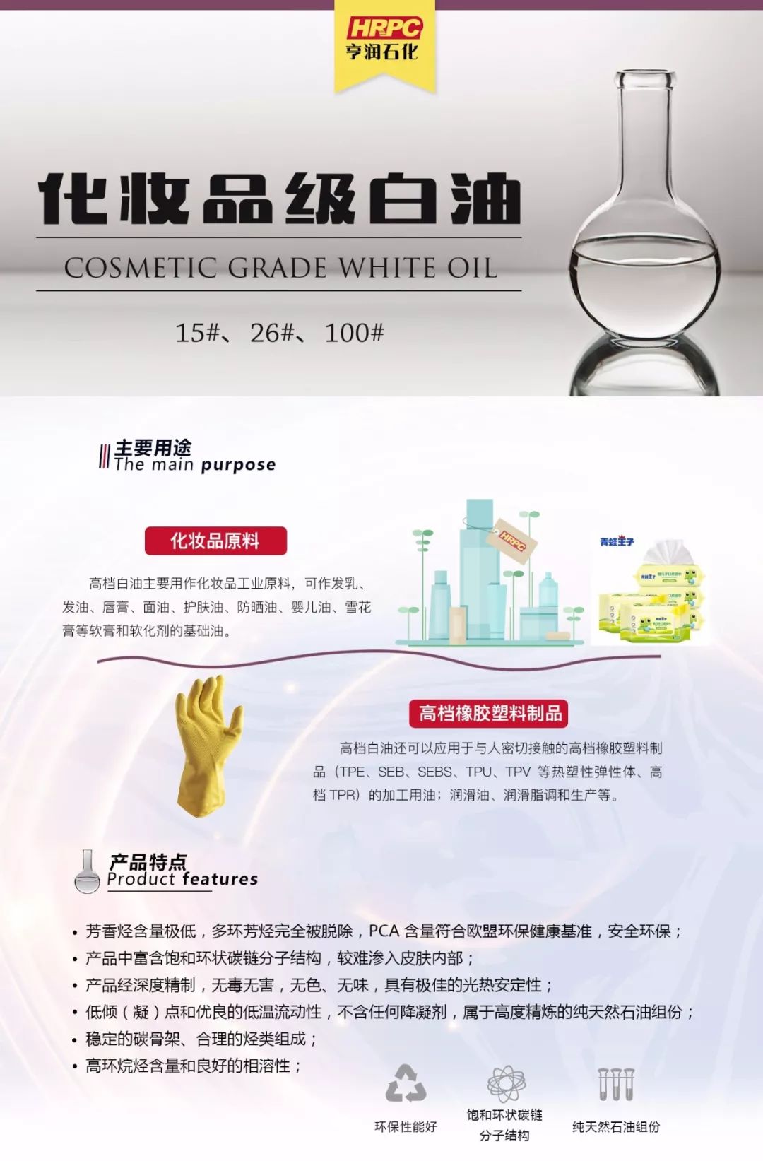 化妆品级白油该产品以新疆克拉玛依低凝环烷基油为原料,经常减压蒸馏切割出适宜馏份,再通过三段高压加氢以及芳烃饱和加氢等组合工艺,生产出最终目的的产品。其主要用作化妆品工业原料,可作发乳、发油、唇膏、面油、护肤油、防晒油、婴儿油、雪花膏等软膏和软化剂的基础油,还可以应用于与人密切接触的高档橡胶塑料制品(TPE/SEB/SEBS/TPU/TPV)等热塑性弹性体,高档TPR的加工用油,润滑油、润滑脂调和生产等。