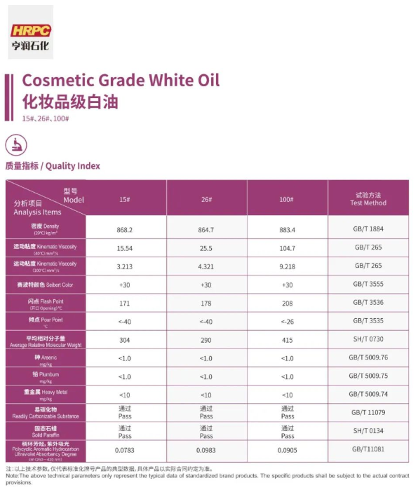 亨润石化化妆品级白油是以新疆克拉玛依低凝环烷基原油为原料,经常减压蒸馏切割出适宜馏分,再通过三段高压加氢以及芳烃饱和加氢等组合工艺,生产出最终目的的产品。适用于化妆工业,可作发乳、发油、唇膏、面油、护肤油、防晒油、婴儿油、雪花膏等软膏和软化剂的基础油,还可以应用于与人密切接触的高档橡胶塑料制品(TPE/SEB/SEBS/TPU/TPV等热塑性弹性体,高档TPR)的加工用油,润滑油、润滑脂调和生产等。化妆级白油可用作抗静电剂、柔润剂、溶媒、溶剂,碳氢化合物,可增加湿润感,但无法直接改善干燥受损的肌肤.对于矿物油是否伤害肌肤众说纷纭,但可以确定的是,不纯的会引起过敏及致痘性,而已经处于伤害或敏感性肤质者应避免使用。由于其色泽及特性,常用于白色膏状药物或保养品中。